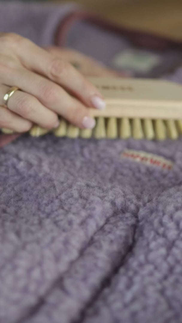 Eine Spezialbürste für Wollpflege aus Naturborsten. Durch regelmäßige Anwendung verlängert die Bürste die Lebensdauer von Kleidungsstücken und hilft der Wolle, ihr natürliches Aussehen und ihre Weichheit zu bewahren.
